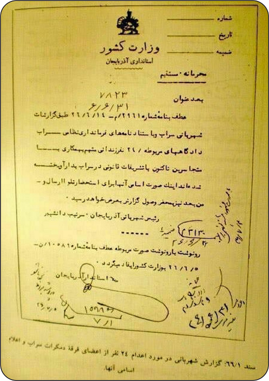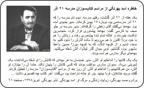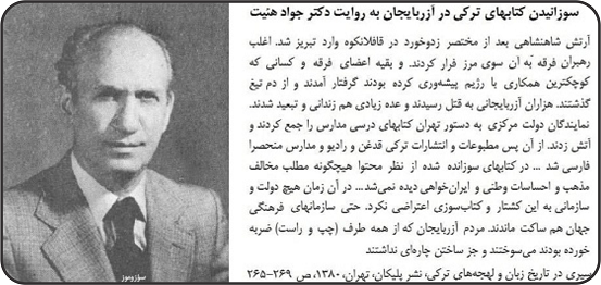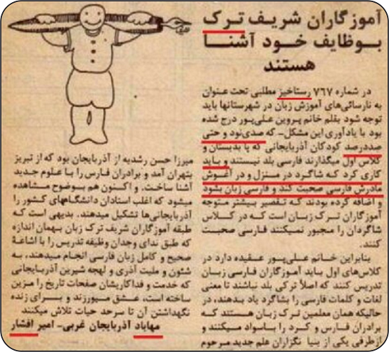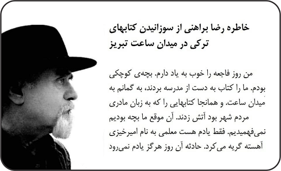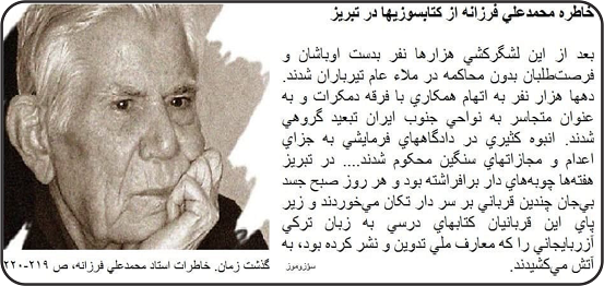 ۱۳۵۷ -نجی گۆنش ایلی ایســلام جمهوریتی حاکیمیته گلدیکده، پهلوی سولاله سینین بو چیرکین، فاشیستیله عېرقېچې سیاستی آچیق آیدین گؤز قاباغیندا ایدی. - آزربایجان تۆرک میللتینین دیلینی ألیندن آلېب فارس دیلینده أریدیلمهسی،
